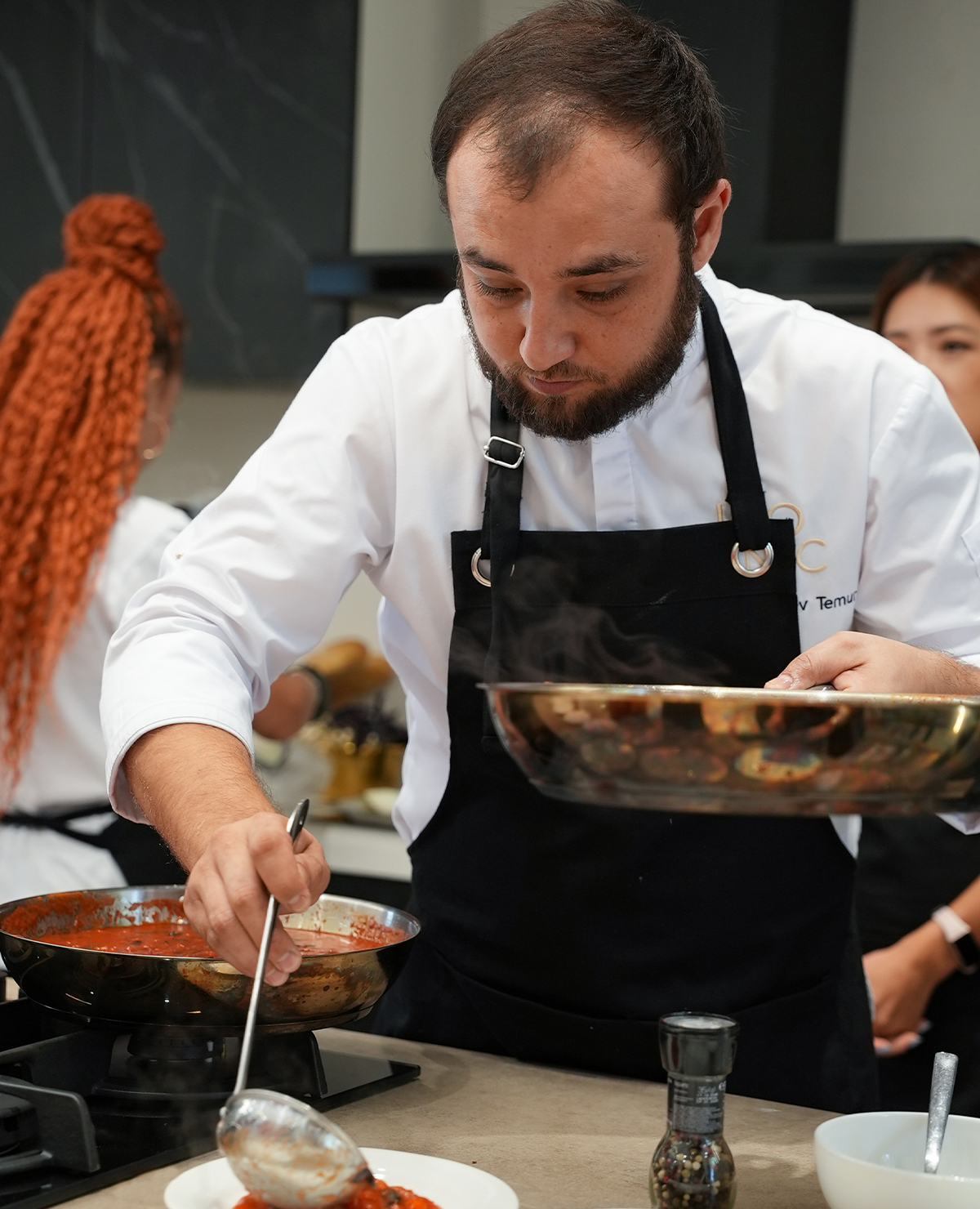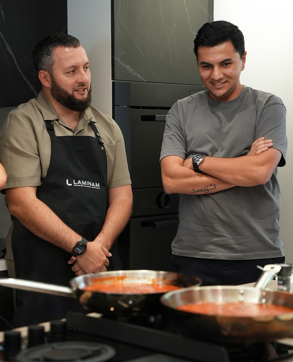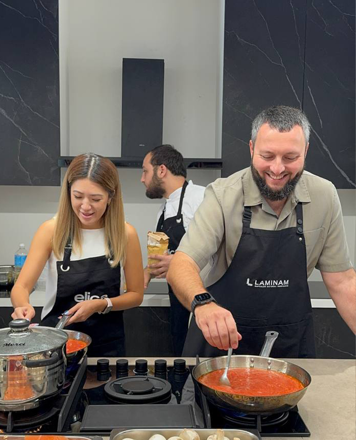 Заур Яхтанигов, представитель Laminam Rus, рассказал о вдохновении, технологиях и уникальных свойствах материалов. Гости не только услышали, но и почувствовали атмосферу творчества — за чашкой ароматного кофе и в формате открытой кухни, где шеф-повар создавал блюда, достойные лучших ресторанов.